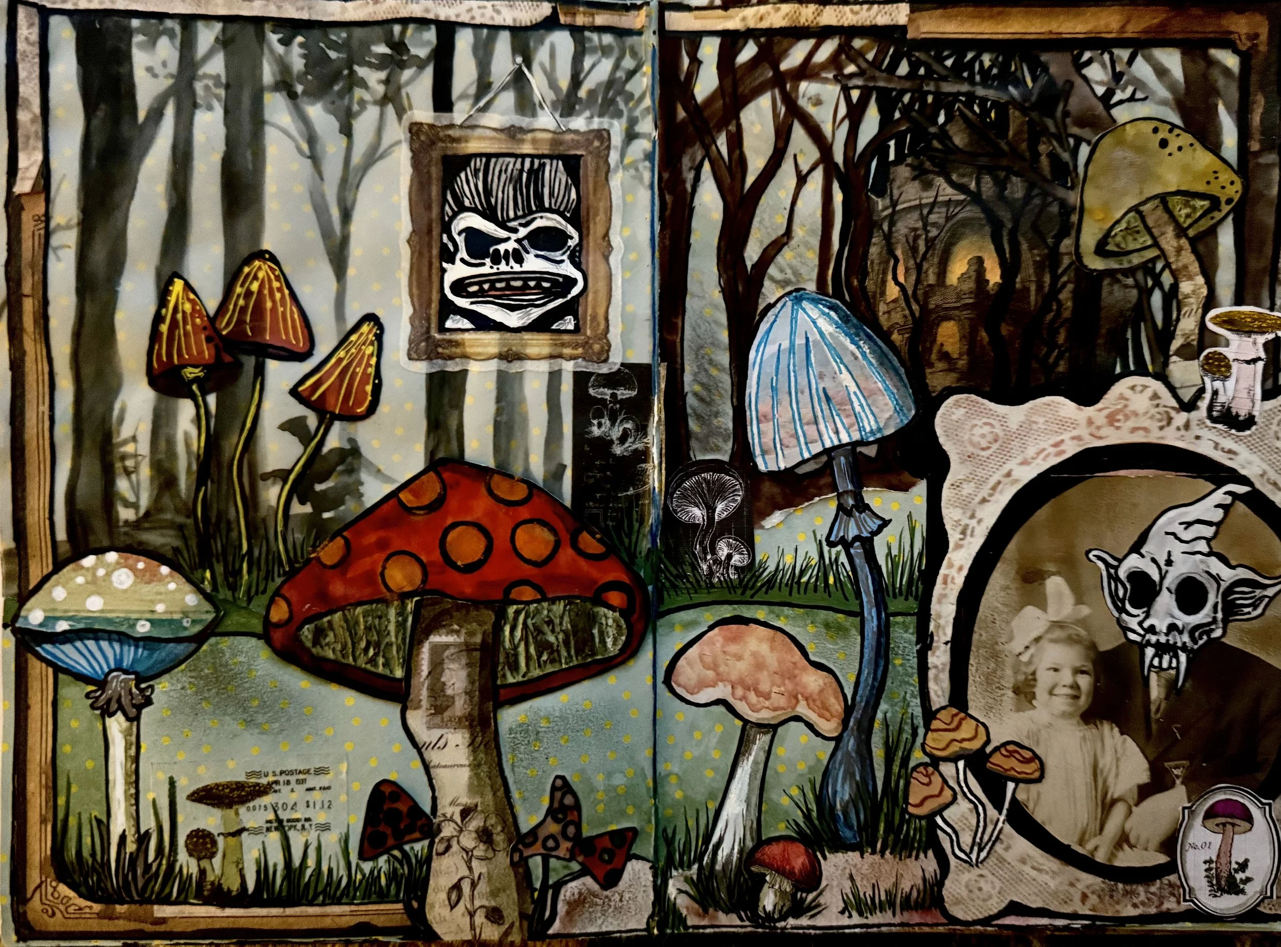 My chaotic studio habits are constantly changing as I tend to immerse myself in different media in bursts before moving on to the next thing. My art features watercolor or acrylic paints combined with mixed media collage, ink, colored pencil, printmaking, textiles and fibers, and whatever else catches my interest in the moment. I work with a variety of contrasting textures gathered from found objects, monoprints, fabric scraps, and recycled paper to create layered backgrounds that push and pull at the balance of the composition, resulting in a gritty yet endearing beauty that often flirts with the macabre. I can often be found digging through the trash and hoarding interesting bits of cardboard, springs and gears from broken electronics, and product packaging that appeals to me.
