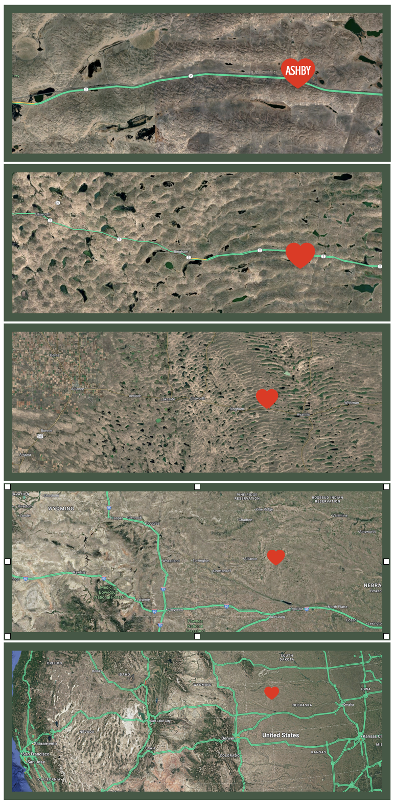 Zooming out from Ashby, Nebraska. Wide open spaces for days!