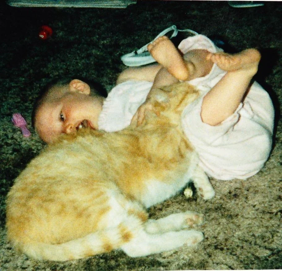 When I was a baby, my mom set me down on a blanket in the grass while she put laundry up on the clothesline. She suddenly heard me laughing exuberantly and found me rolling around in the grass with a huge, battle worn, unknown stray tom cat. Tommy remained an indoor/outdoor cat, coming and going as he pleased, and showing up at odd hours with fresh scrapes and torn up ears. While at home, he allowed my sister and I to dress him in baby clothes and push him around in a stroller.