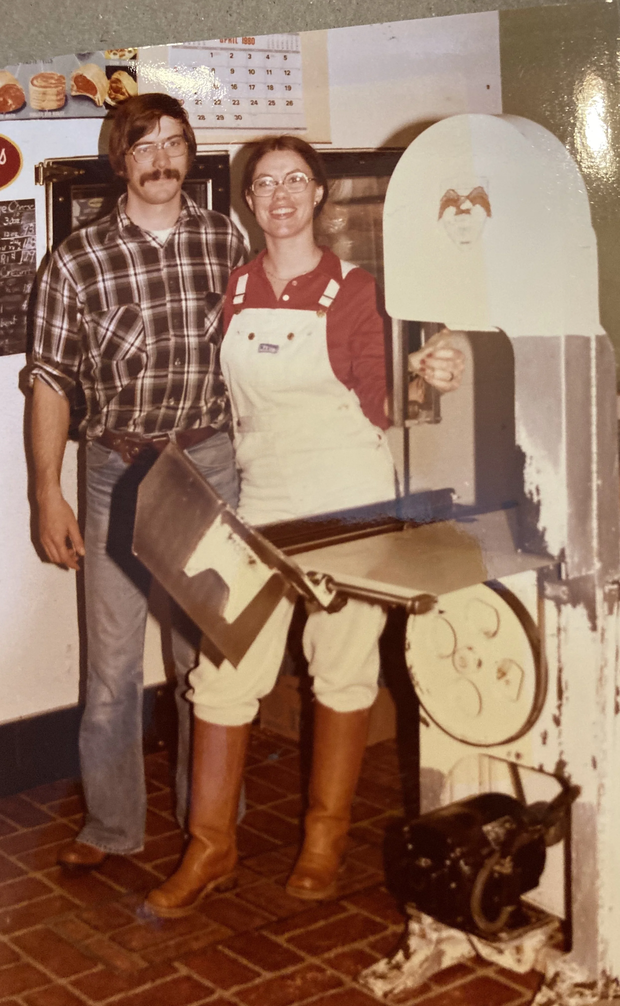 My parents owned the only grocery store in town. Here they are in the butcher shop getting ready to do something terrifying to a side of beef.